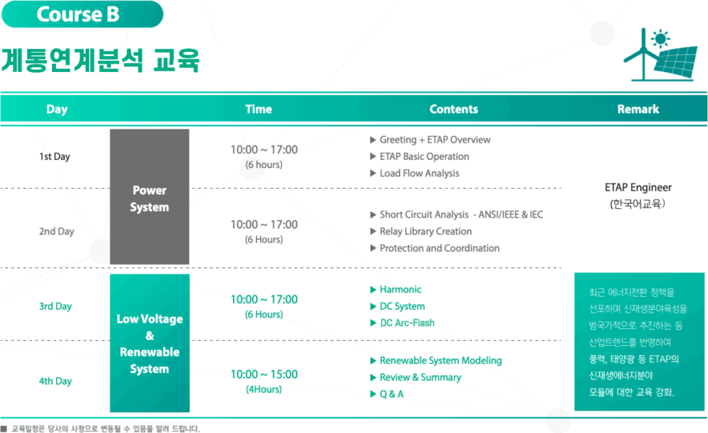 최근 각광을 받고 있는 신재생에너지 분야에 대한 Needs를 반영하여 전력계통해석 코스와 계통연계분석 코스로 강의를 보다 세분화하고, 각 사업분야에 맞게 교육을 진행함으로써 실무자들이 현장에 돌아가 각 상황에 맞는 운영을 할 수 있도록 하는 현장맞춤형으로 교육을 구성하였습니다.